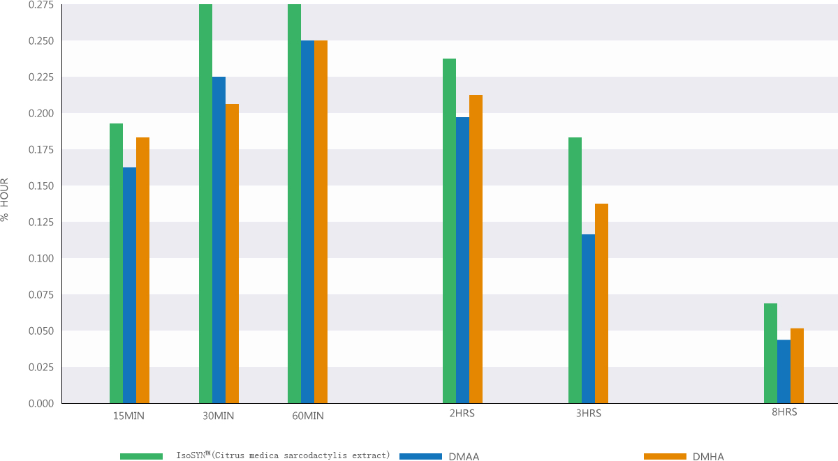 This is where IsoSYN™(Citrus medica sarcodactylis extract) can really flex its muscles. IsoSYN™(Citrus medica sarcodactylis extract) was designed to be a very fast acting ingredient. When compared to it's compounding cousin, DMAA and DMHA, that was designed to hit peak effectiveness between 1 - 2 hours after consumption; IsoSYN™(Citrus medica sarcodactylis extract) has been designed to reach peak effectiveness within 15 - 30 minutes after consumption.